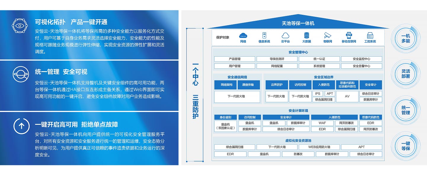 等保一体机是安恒信息根据多年SAAS云服务的经验技术积累,结合公司全线安全产品的核心能力,融入等保自测评等特色服务,针对性打造的安全产品。具备丰富完善的安全能力,专用于快速解决等保建设中的难点与痛点。