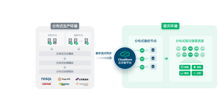 采用无限制横向扩展结构,完全支持分布式集群架构灾备。可以通过分布式协调器与分布式快照,保证备份数据最终一致可用。当分布式架构单个或多个节点故障时,真正做到数据不丢失、业务可恢复,以及分布式业务组容灾切换一致性。灾备环境可确保用户有一个比例缩小但功能齐全的生产环境副本,在不影响前端业务正常运行的情况下,用于仿真测试、容灾演练等需求。