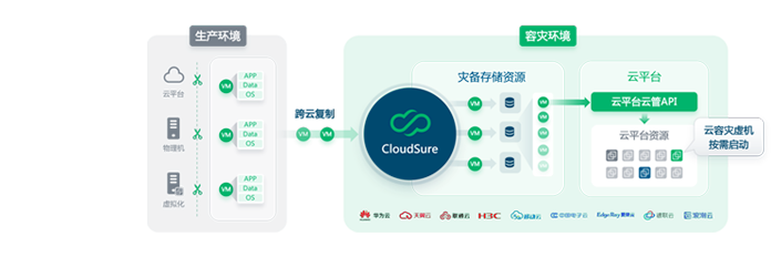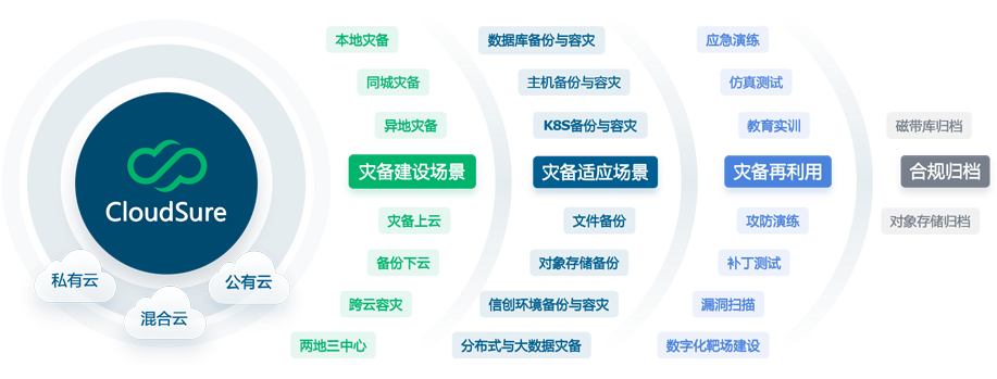 CloudSure支持单机、双机、集中存储等传统架构,以及云、容器、大数据、分布式等新架构,可以应用于混合架构灾备到云、异构多云互为容灾、分布式与大数据灾备、云原生K8S灾备、两地三中心灾备等多种场景方案。