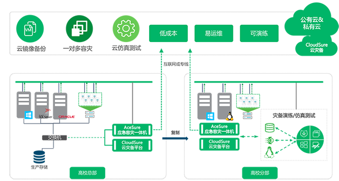无论高校有多少个数据中心、部门、云平台,都可以通过AceSure/CloudSure实现故障切换和灾难恢复测试,无需手动关联不同环境之间的活动。AceSure/CloudSure基于数据实时虚拟化技术的应急接管与仿真演练,可随机应急机房内所有故障服务器(虚机或物理机),可根据故障点基于任意时间点,实现RPO接近于0的高要求,精简RTO时间,几分钟顶替原机使用,保证业务连续性及业务数据有效性。