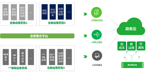 依托云影灾备技术,使业务从物理层、虚拟层或云IaaS层解耦,把操作系统、应用、数据打包成兼容主流云平台架构的快照文件,实现任意x86环境下异构云、虚拟化、物理机之间的相互迁移。通过该解决方案,保证政府部门在将现有数据中心业务系统上政务云的时候,业务在线迁移不停机;节约了传统迁移方式所花费的大量时间,简化了各方资源协调/长时间测试验证等繁琐工作,实现了简单迁移、高效迁移、安全迁移,满足了政务云迁移时的高标准严要求。